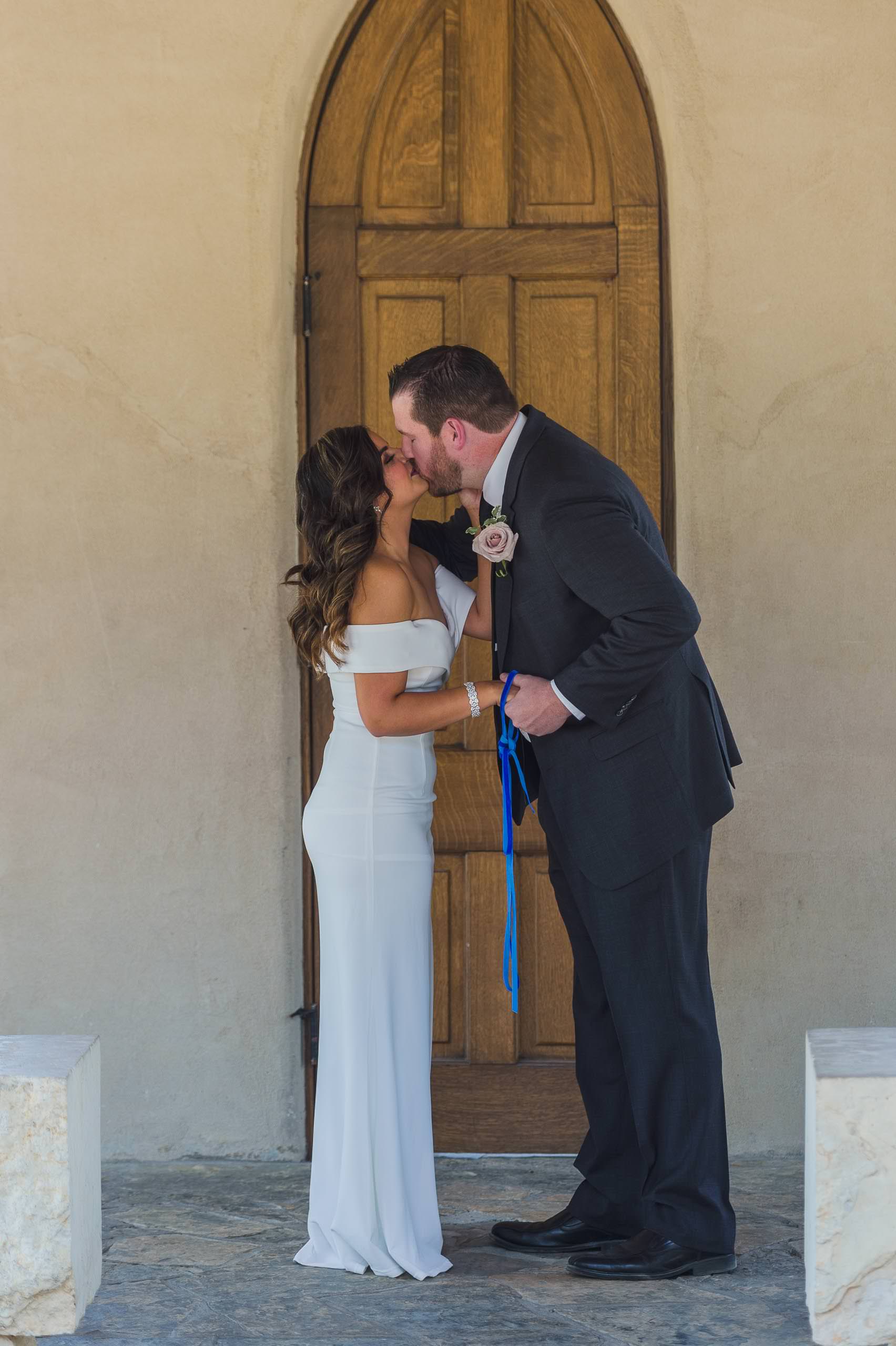I love that they added a handfasting ceremony within their wedding ceremony. (When I’ve seen this done before, the binding is usually removed before the kiss. However, Pastor Tim let them stay handfast together through the kiss, which I thought was sweet! He also got out of the shot for the kiss! Another hallmark signature from Texas Wedding Ministers worth mentioning!) Sammantha chose a beautiful royal blue velvet ribbon for this tradition. It perfectly matched her shoes!